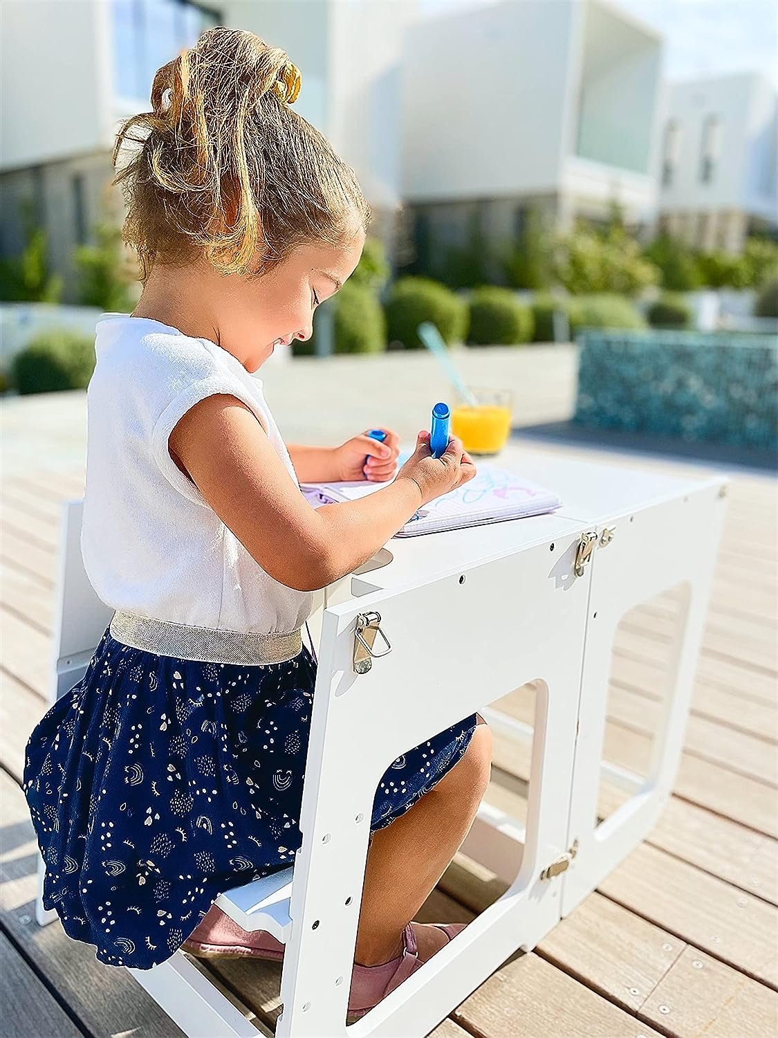 Aunque la torre de cocina exacta que teníamos ya no está disponible, encontré esta torre estilo Montessori que creo que es aún mejor; ¡se pliega en una adorable mesa, lo que significa que obtienes dos piezas de mobiliario útiles en un solo regalo!